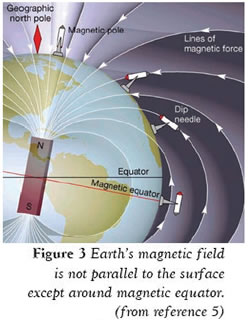 Magnetesomes passively align bacteria parallel to the geomagnetic field but do not exert a force on bacteria to change their speed. Aligned with the magnetic field, the bacteria decide to either move towards south or north. Interestingly, almost all magnetotactic bacteria in northern hemisphere are north seeking, almost all magnetotactic bacteria in southern hemisphere are south seeking, and magnetotactic bacteria living around the geomagnetic equator consist of almost equal number of bacteria of each magnetic polarity. The bacteria in northern and southern hemispheres may have different polarities but they have one thing in common; they both move downwards. The geomagnetic field is not exactly parallel to the earth’s surface except around the geomagnetic equator. As it may seem in figure-3, the magnetic field lines are tilted up and down respectively in southern and northern hemispheres. Therefore the north seeking bacteria in northern hemisphere end up at the bottom of the water and so do the south seeking bacteria in southern hemisphere. Most of the magnetotactic bacteria cannot survive in atmospheric oxygen levels, so sensing vertical position and moving downwards, where oxygen concentration is low, is crucial for them.