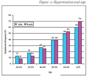 Almost a quarter (26 percent) of the world’s adult population suffers from high blood pressure. It is estimated that this number will reach 29 percent by the year 2025. These average statistics based on the adult population of the world includes people of various age groups and from different countries. The risk of hypertension increases with age. While the figure for 20–29 year old males is 13 percent, it increases to 40 percent between the ages of 50–59, and reaches over 60 percent after the age of seventy. Although there are slight variations in women, many of the figures are almost the same (Figure 1).