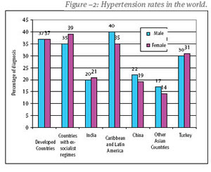 In contrast with the estimated numbers given above, the figures for hypertension in the different regions present significant variations. Statistically, the number of hypertension cases increases according to the welfare status of the society. In economically developed countries, 37 percent of the adult population has high blood pressure, which is a considerably elevated number in comparison with the world average of 26 percent. Furthermore, 70 percent of the males and 80 percent of the females over the age of seventy living in economically developed countries suffer from high blood pressure. However, in economically underdeveloped countries, the number of hypertension cases is very low.