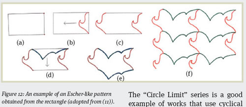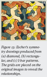 Figure 13 presents examples of Escher’s symmetry drawings. Figure 13(a) utilizes a diamond pattern by converting it to a man applying a rotation of 120. whereas Figure 13(b) was created from a rectangle with a rotation of 180. In Figure 13(c), Escher was able to take the I-Bar pattern and adapt it to the totally dissimilar motifs of angels and devils.