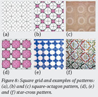 Figure 8 and Figure 9 illustrate the usage of circles on a square grid in two different ways. The square-hexagon pattern in Figure 8(c) is commonly used on the ceilings of mosques whereas variations of the star-cross pattern in Figure 8(c) have mostly been used on walls.