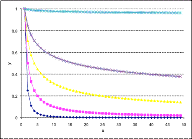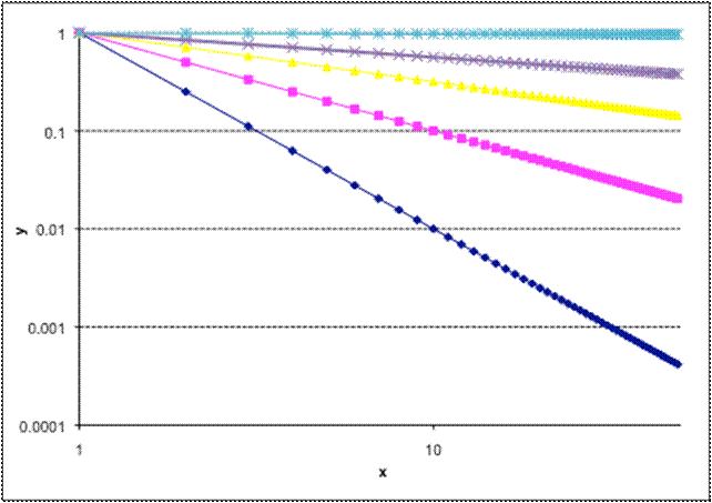 The power law relationships are traditionally expressed with a negative exponent, which simply means the inverse of the quantity. That is, y  ͌ x–α is equivalent to y  ͌ 1/xα. For example, when a is 2, y will reduce from 1/4 (i.e. 0.25) to 1/9 (i.e. ~0.11) if x grows from 2 to 3. Likewise, when a is 0.5, y will reduce from 1/2 (i.e. 0.5) to 1/3 (i.e. 0.33) if x grows from 4 to 9. For those who enjoy graphs, Figure 2 illustrates these mathematical relationships in linear and logarithmic scales.