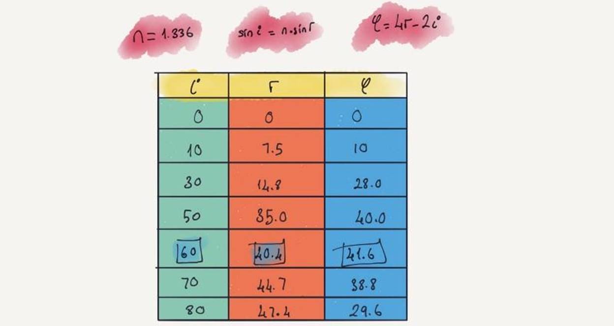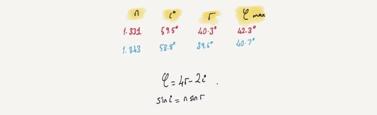 If you recall, the index of refraction for water is 1.336. If we take any value of “i” on the table and apply Snell’s law, we can easily calculate values of r. And then, if we use the formula φ=4r — 2i, we can come up with the values of φ. This is illustrated in Figure 7.0.