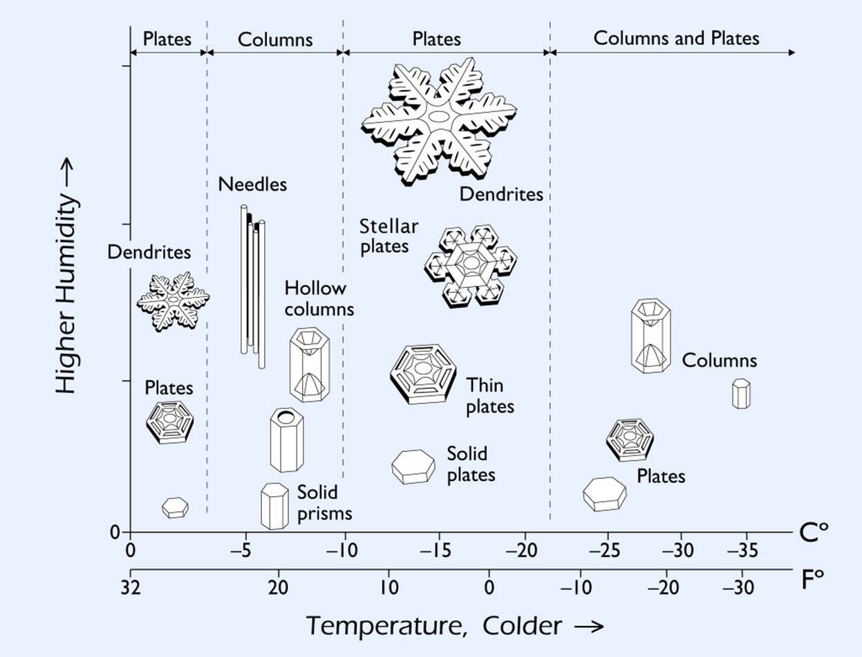 The Snow Crystal Morphology Diagram. Source: Snow Crystals - http://www.snowcrystals.com/science/science.html