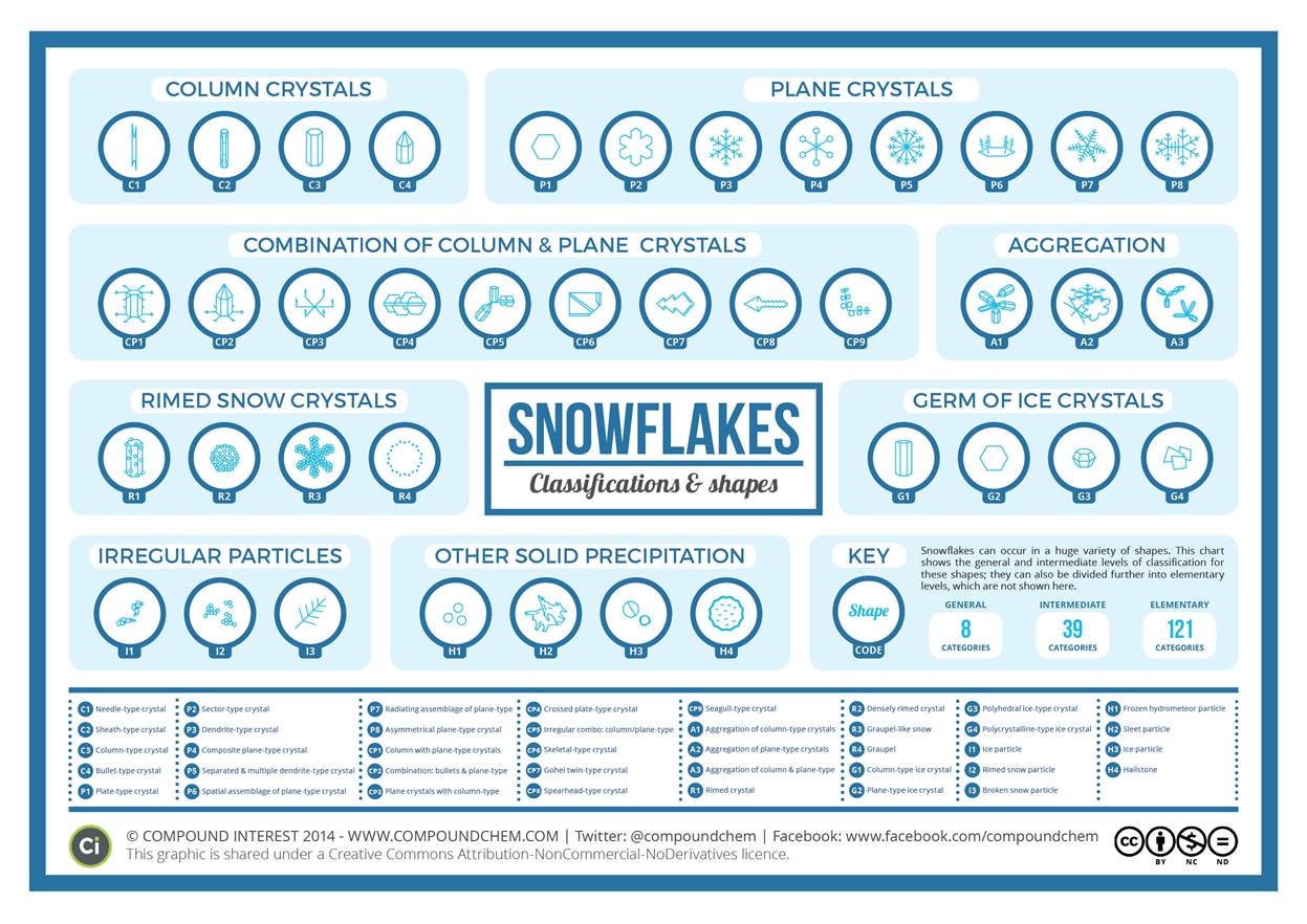 There are two key elements which affect the structure of a snowflake: temperature and moisture. Each time the temperature or the amount of moisture change, the structure of a snowflake changes. If you check the snow crystal morphology diagram below, you will see that when the temperature nears 0° and humidity is high, the structure of a snowflake will be flowery. Flowery structures are called dendrites. When you make it a little bit colder, the structure will be fancy hexagonal plates. We can apply many combinations and get varying structures.