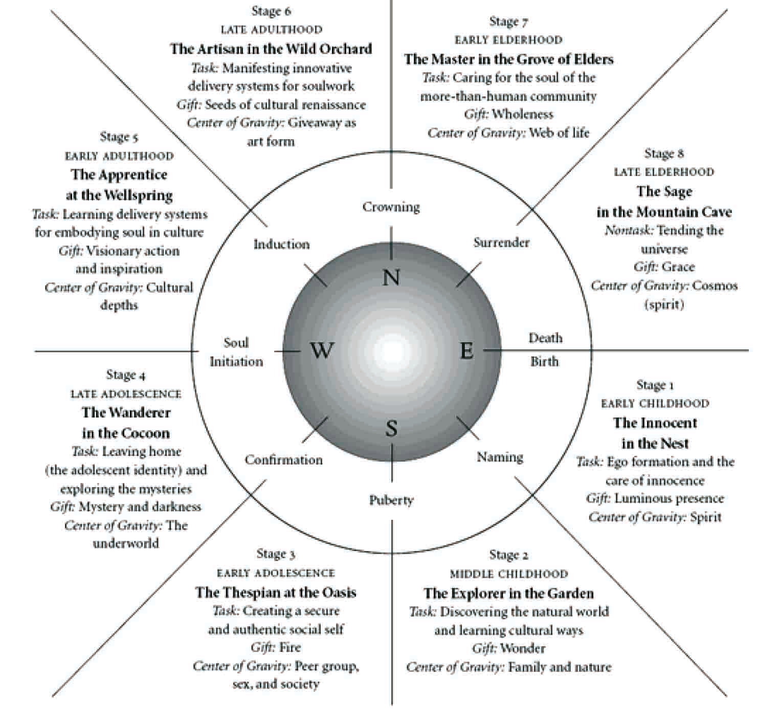 Many remain stuck in the late adolescent psycho-social phase of development due to an absence of the village and an absence of rites of passage, which celebrate or confirm a life transition. Plotkin has refined the four life phases of childhood, adolescence, adulthood and elderhood into eight – that is, two stages per life phase. The model he has defined can be seen below. The life cycle begins and ends in the east and moves clockwise/earthwise around the circle.