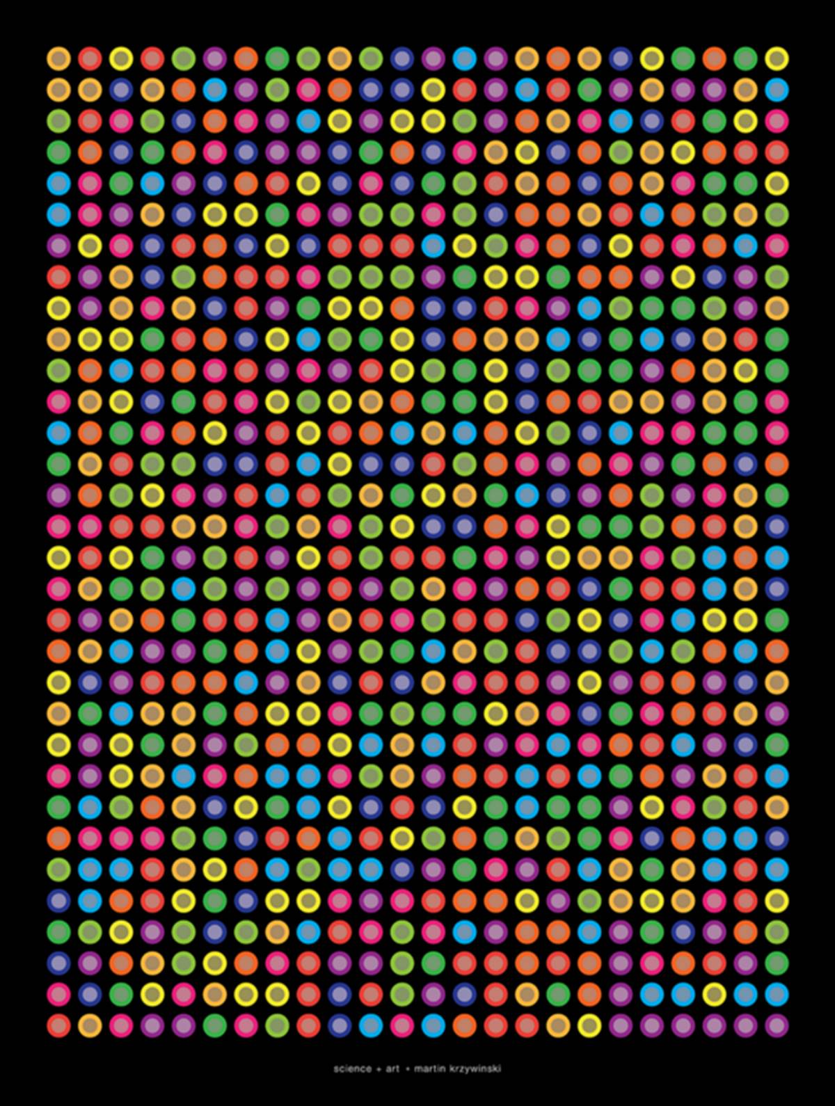There is an interesting and artistic way to show the randomness of pi. Some scientists might be happy with their tedious scatter plots, but there are some artists who use colors for data visualization to communicate with the public. Martin Krzywinski is one such artist, who found beauty and artistry in the randomness of Pi. He took the digits of pi and gave each digit a different color. For instance, he gave 3 the color orange, 1 as red, 4 as yellow, and so on. Then he made a beautiful poster. And if you look at it carefully, you do not see any particular pattern to the colors.
