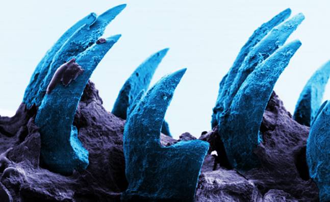 The structure of the sea snail’s teeth is also a masterpiece of material science. The dazzling durability of its structure provides optimum strength when scraping food off of rock surfaces.